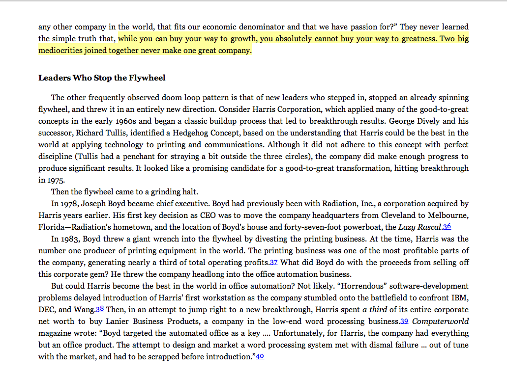 “While you can buy your way to growth, you absolutely cannot buy your way to greatness. Two big mediocrities joined together never make a great company.”