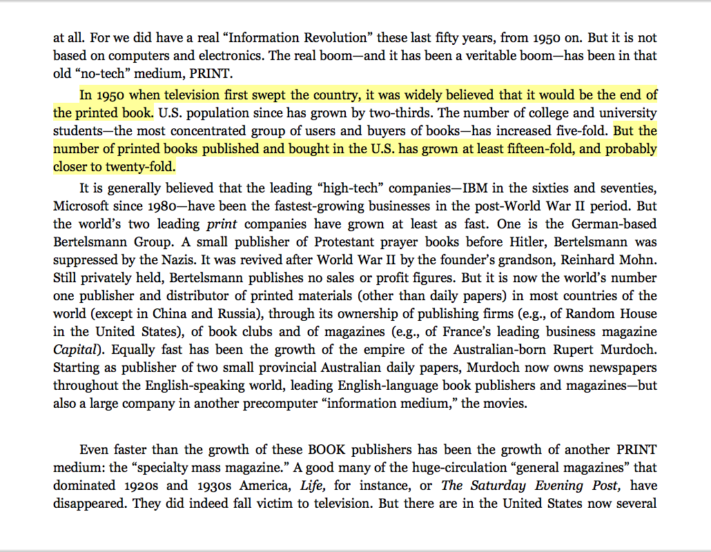 “In 1950 when television first swept the country, it was widely believed that it would be the end of the printed book. . . . But the number of printed books published and bought in the U.S. has grown at least fifteen-fold, and probably closer to twenty-fold.”
