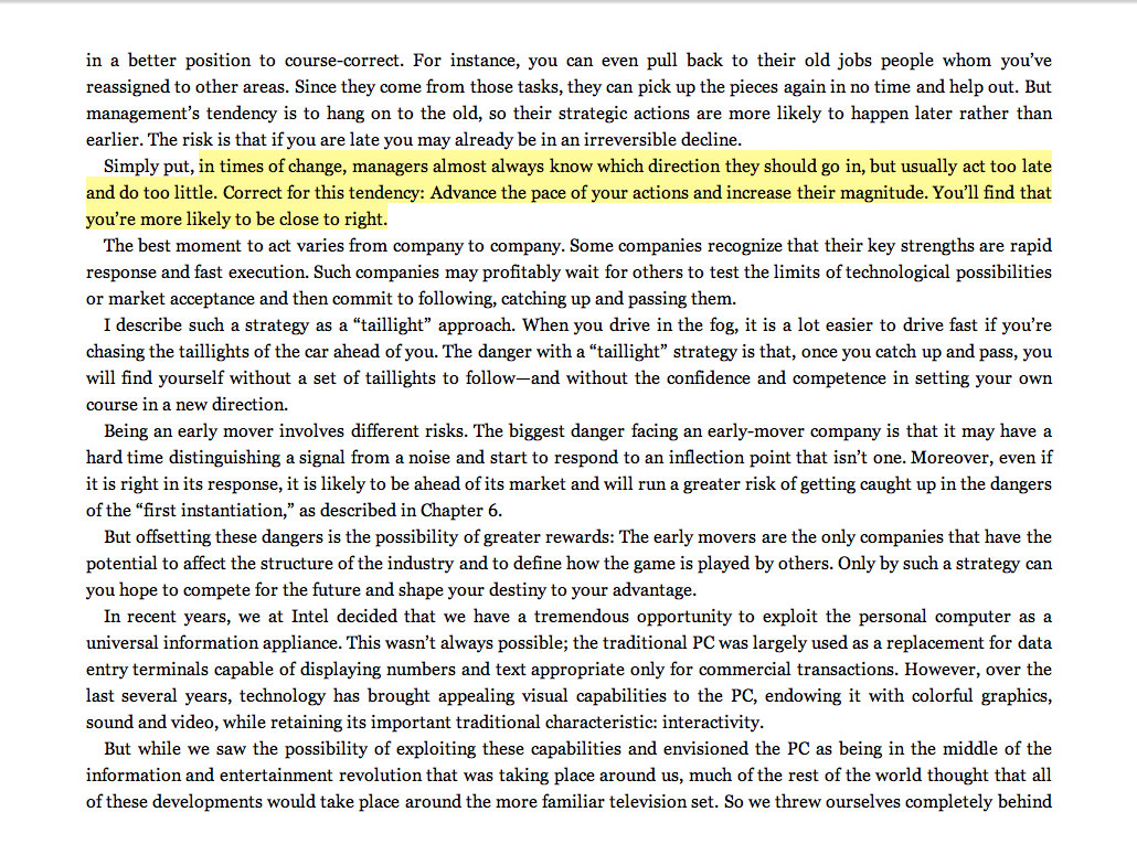 “In times of change, managers almost always know which direction they should go in, but usually act too late and do too little. Correct for this tendency: Advance the pace of your actions and increase their magnitude. You’ll find that you’re more likely to be close to right.”