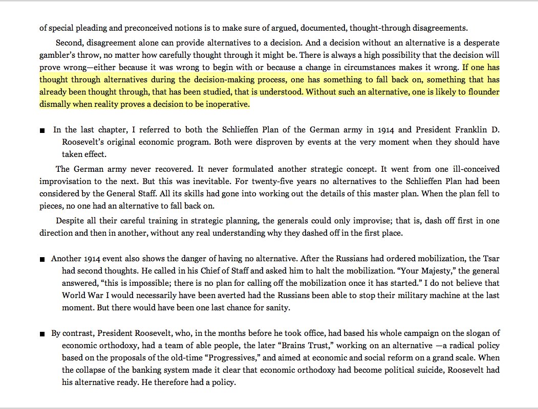 “If one has thought through alternatives during the decision-making process, one has something to fall back on, something that has already been thought through, that has been studied, that is understood. Without such an alternative, one is likely to flounder dismally when reality proves a decision to be inoperative.”