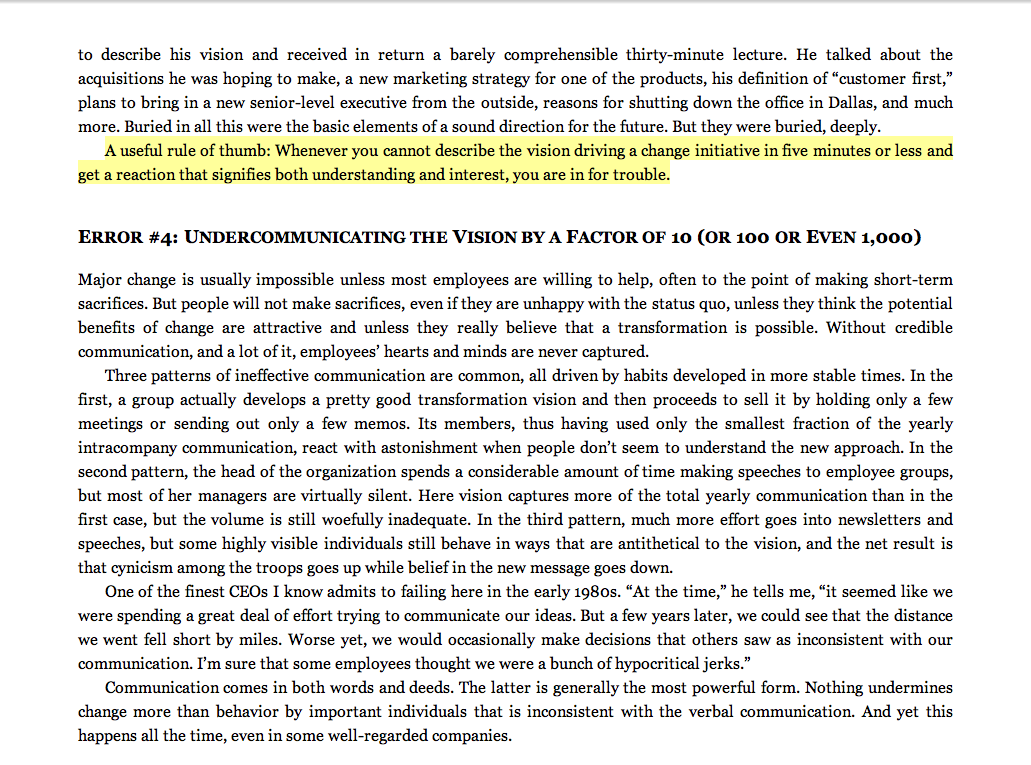 “A useful rule of thumb: If you can’t communicate the vision to someone in five minutes or less and get a reaction that signifies both understanding and interest, you are not yet done with this phase of the transformation process.”