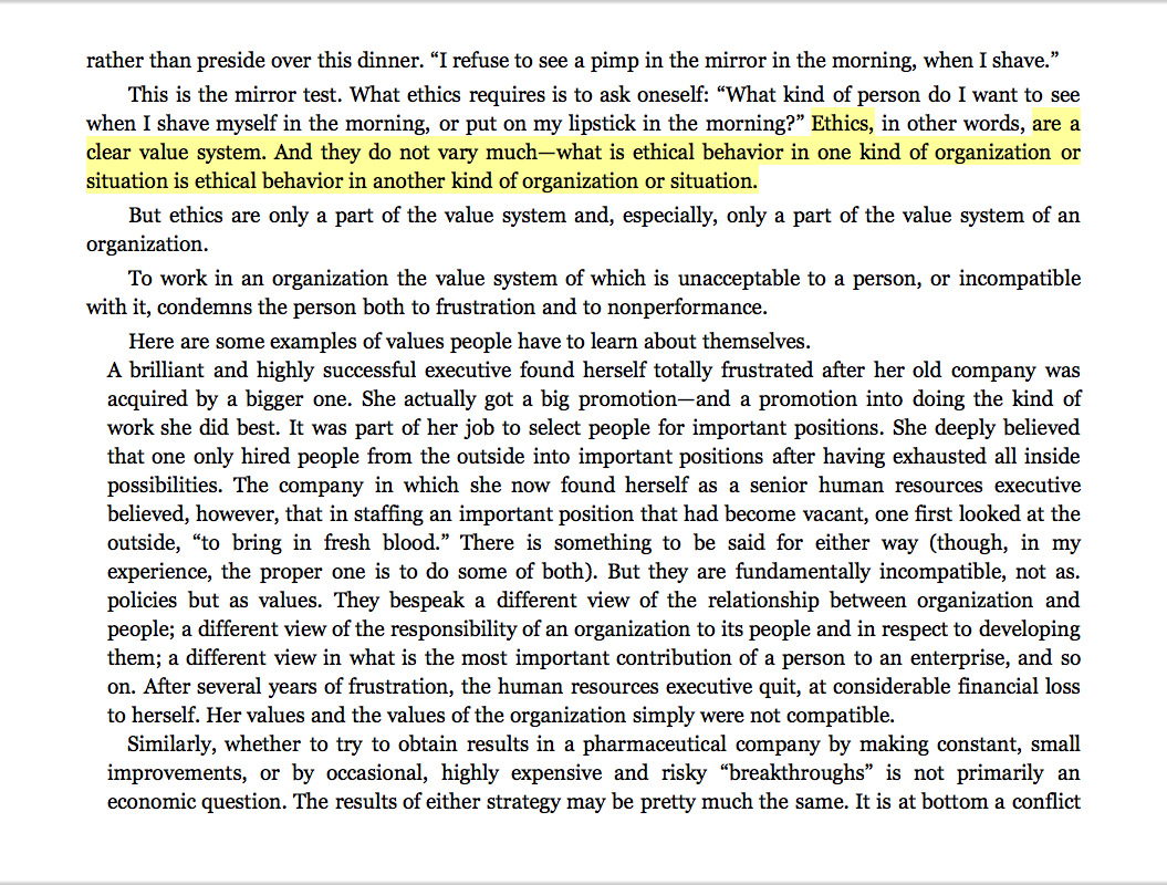 “Ethics . . . are a clear value system. And they do not vary much—what is ethical behavior in one kind of organization or situation is ethical behavior in another kind of organization or situation.”