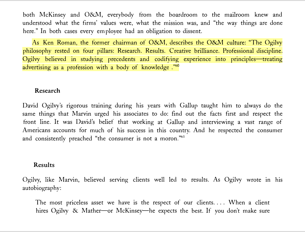 “As Ken Roman, the former chairman of [Ogilvy & Mather], describes the O&M culture: ‘The Ogilvy philosophy rested on four pillars: Research. Results. Creative brilliance. Professional discipline. Ogilvy believed in studying precedents and codifying experience into principles—treating advertising as a profession with a body of knowledge.’”