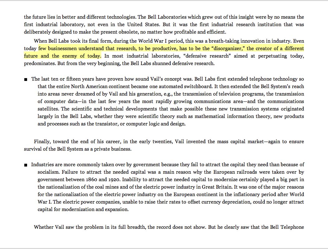 “Few businessmen understand that research, to be productive, has to be the ‘disorganizer,’ the creator of a different future and [as such] the enemy of today.”