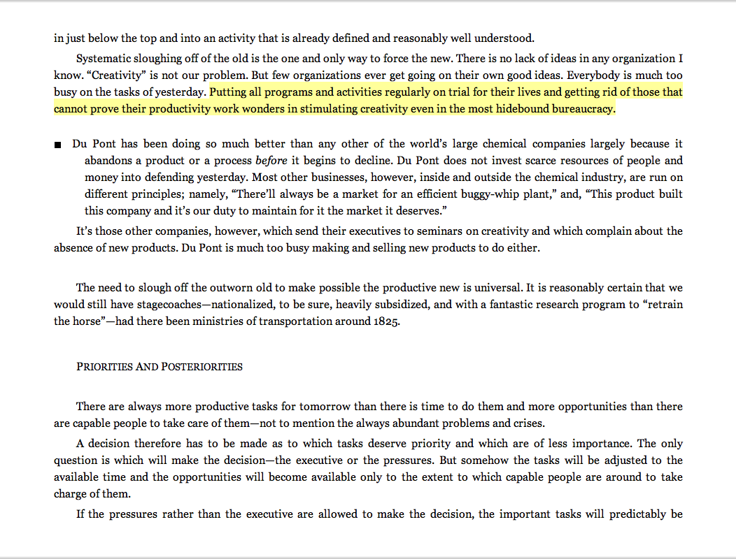 “Putting all programs and activities regularly on trial for their lives and getting rid of those that cannot prove their productivity work wonders in stimulating creativity even in the most hidebound bureaucracy.”