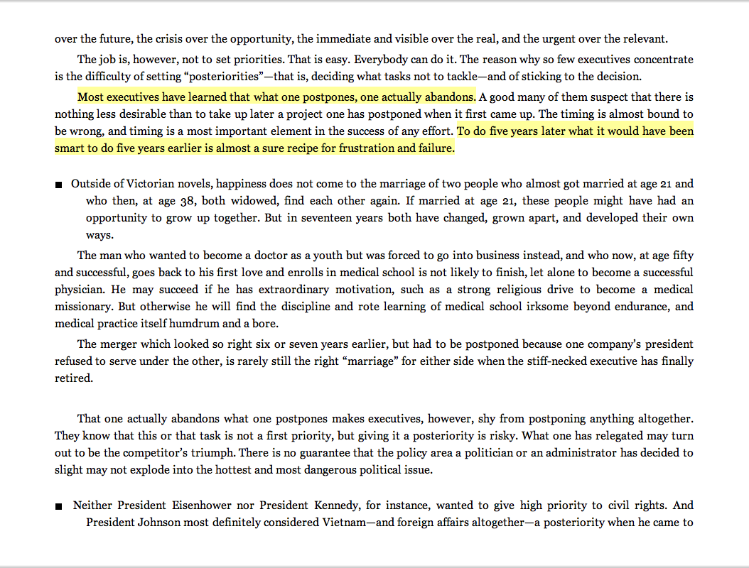 “Most executives have learned that what one postpones, one actually abandons. . . . To do five years later what it would have been smart to do five years earlier is almost a sure recipe for frustration and failure.”