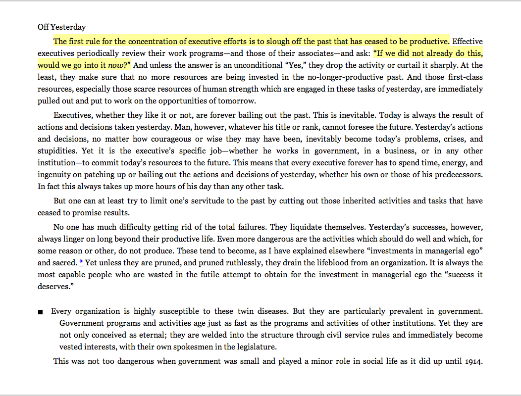 “The first rule for the concentration of executive efforts is to slough off the past that has ceased to be productive. . . . ‘If we did not already do this, would we go into it now?’ ”