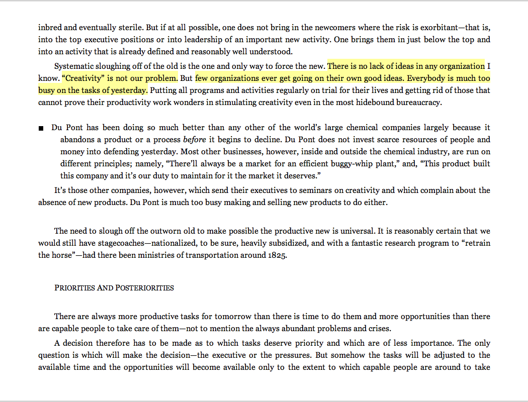 “There is no lack of ideas in any organization. . . . ‘Creativity’ is not [the] problem. But few organizations ever get going on their own good ideas. Everybody is much too busy on the tasks of yesterday.”