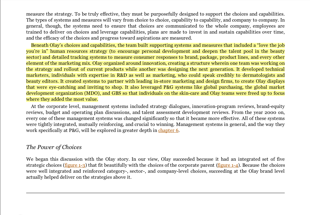 “Beneath Olay’s choices and capabilities, the team built supporting systems and measures that included a ‘love the job you’re in’ human resources strategy (to encourage personal development and deepen the talent pool in the beauty sector) and detailed tracking systems to measure consumer responses to brand, package, product lines, and every other element of the marketing mix. Olay organized around innovation, creating a structure wherein one team was working on the strategy and rollout of current products while another was designing the next generation. It developed technical marketers, individuals with expertise in R&D as well as marketing, who could speak credibly to dermatologists and beauty editors. It created systems to partner with leading in-store marketing and design firms, to create Olay displays that were eye-catching and inviting to shop. It also leveraged P& G systems like global purchasing, the global market development organization (MDO), and GBS so that individuals on the skin-care and Olay teams were freed up to focus where they added the most value.”