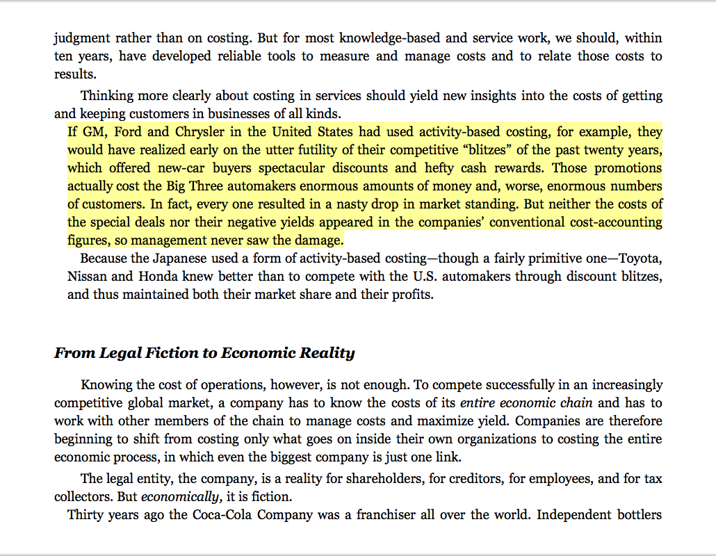 “If GM, Ford and Chrysler in the United States had used activity-based costing, for example, they would have realized early on the utter futility of their competitive ‘blitzes’ of the past twenty years, which offered new-car buyers spectacular discounts and hefty cash rewards. Those promotions actually cost the Big Three automakers enormous amounts of money and, worse, enormous numbers of customers. In fact, every one resulted in a nasty drop in market standing. But neither the costs of the special deals nor their negative yields appeared in the companies’ conventional cost-accounting figures, so management never saw the damage.”
