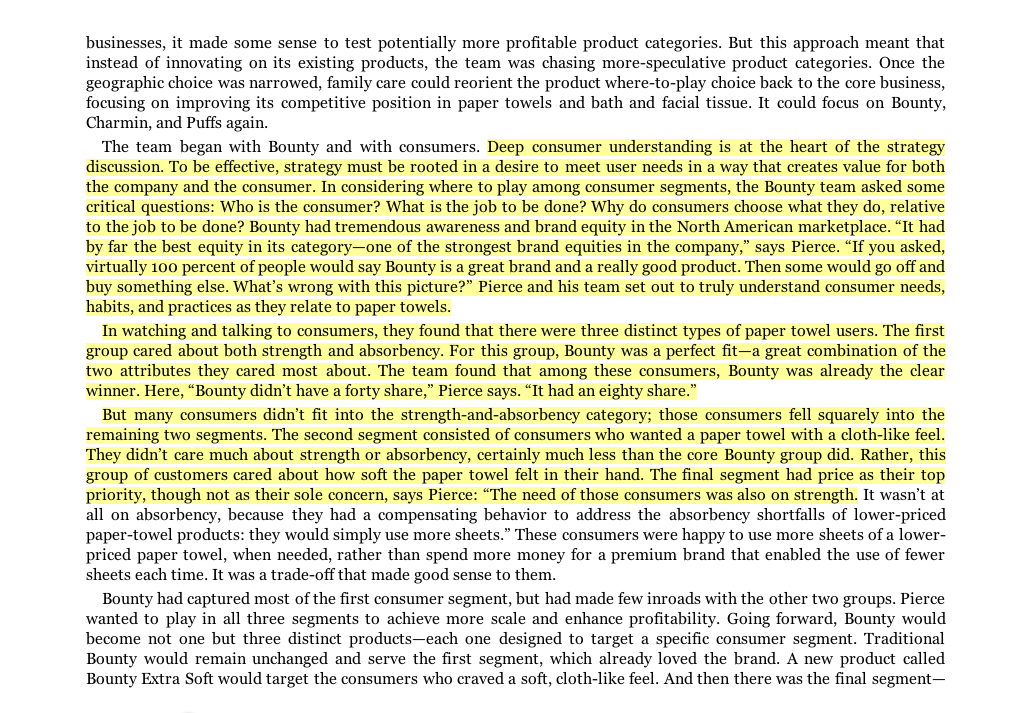 Who is the consumer? What is the job to be done? Why do consumers choose what they do, relative to the job to be done? Bounty had tremendous awareness and brand equity in the North American marketplace. ‘It had by far the best equity in its category— one of the strongest brand equities in the company,’ says Pierce. ‘If you asked, virtually 100 percent of people would say Bounty is a great brand and a really good product. Then some would go off and buy something else. What’s wrong with this picture?’ Pierce and his team set out to truly understand consumer needs, habits, and practices as they relate to paper towels. In watching and talking to consumers, they found that there were three distinct types of paper towel users. The first group cared about both strength and absorbency. For this group, Bounty was a perfect fit—a great combination of the two attributes they cared most about. The team found that among these consumers, Bounty was already the clear winner. Here, ‘Bounty didn’t have a forty share,’ Pierce says. ‘It had an eighty share.’ But many consumers didn’t fit into the strength-and-absorbency category; those consumers fell squarely into the remaining two segments. The second segment consisted of consumers who wanted a paper towel with a cloth-like feel. Rather, this group of customers cared about how soft the paper towel felt in their hand. The final segment had price as their top priority, though not as their sole concern, says Pierce: ‘The need of those consumers was also on strength.’”