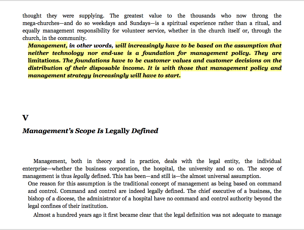 “Management . . . will increasingly have to be based on the assumption that neither technology nor end-use is a foundation for management policy. They are limitations. The foundations have to be customer values and customer decisions on the distribution of their disposable income. It is with those that management policy and management strategy increasingly will have to start.”