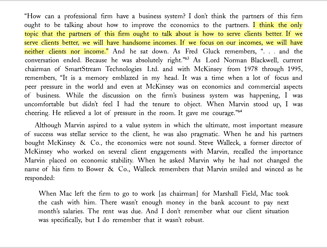 “ ‘I think the only topic that the partners of this firm ought to talk about is how to serve clients better. If we serve clients better, we will have handsome incomes. If we focus on incomes, we will have neither clients nor income.’ ”