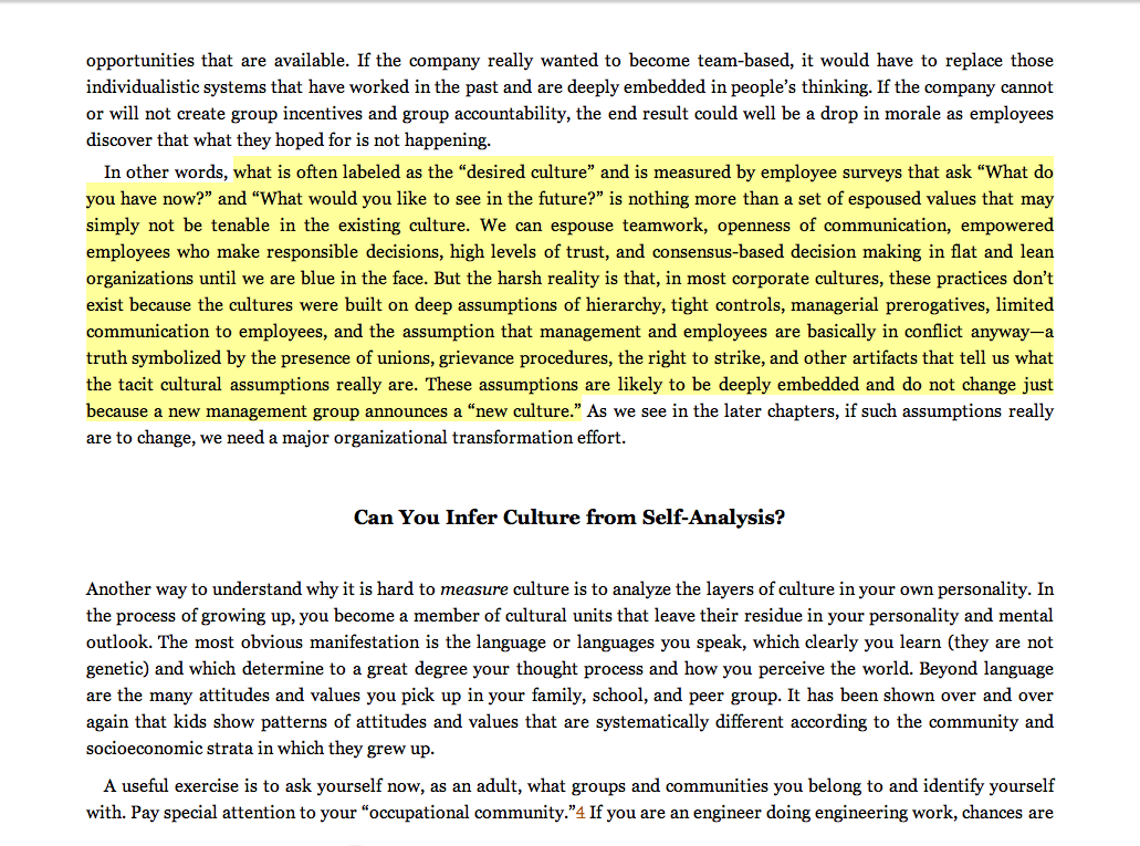 “What is often labeled as the ‘desired culture’ . . . is nothing more than a set of espoused values that may simply not be tenable in the existing culture. We can espouse teamwork, openness of communication, empowered employees who make responsible decisions, high levels of trust, and consensus-based decision making in flat and lean organizations until we are blue in the face. But the harsh reality is that in most corporate cultures these practices don’t exist because the cultures were built on deep assumptions of hierarchy, tight controls, managerial prerogatives, limited communication to employees, and the assumption that management and employees are basically in conflict anyway—a truth symbolized by the presence of unions, grievance procedures, the right to strike, and other artifacts that tell us what the cultural assumptions really are. These assumptions are likely to be deeply embedded and do not change just because a new management group announces a ‘new culture.’ ”