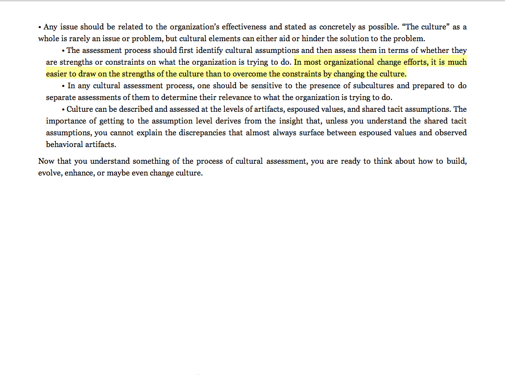 “In most organizational change efforts, it is much easier to draw on the strengths of the culture than to overcome the constraints by changing the culture.”