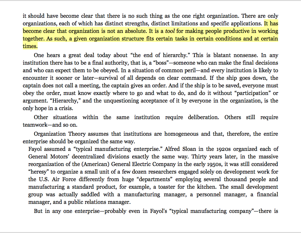“It has become clear that organization is not an absolute. It is a tool for making people productive in working together. As such, a given organization structure fits certain tasks in certain conditions and at certain times.”