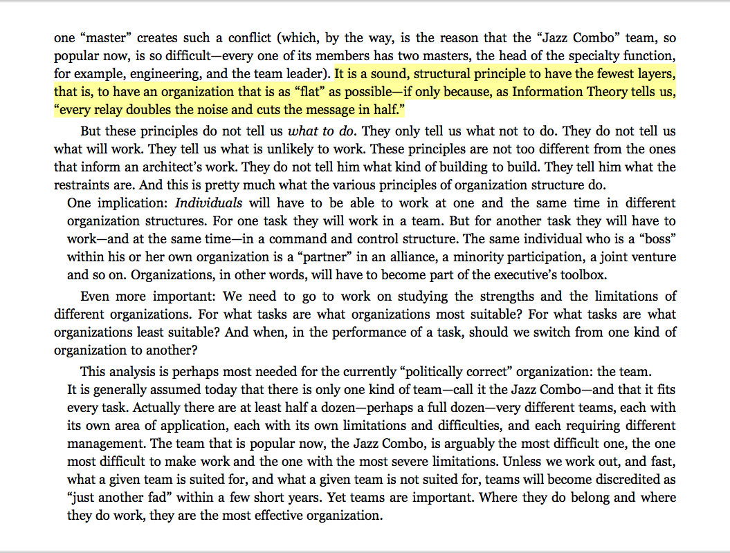 “It is a sound, structural principle to have the fewest layers, that is, to have an organization that is as ‘flat’ as possible—if only because, as Information Theory tells us, ‘every relay doubles the noise and cuts the message in half.’ ”