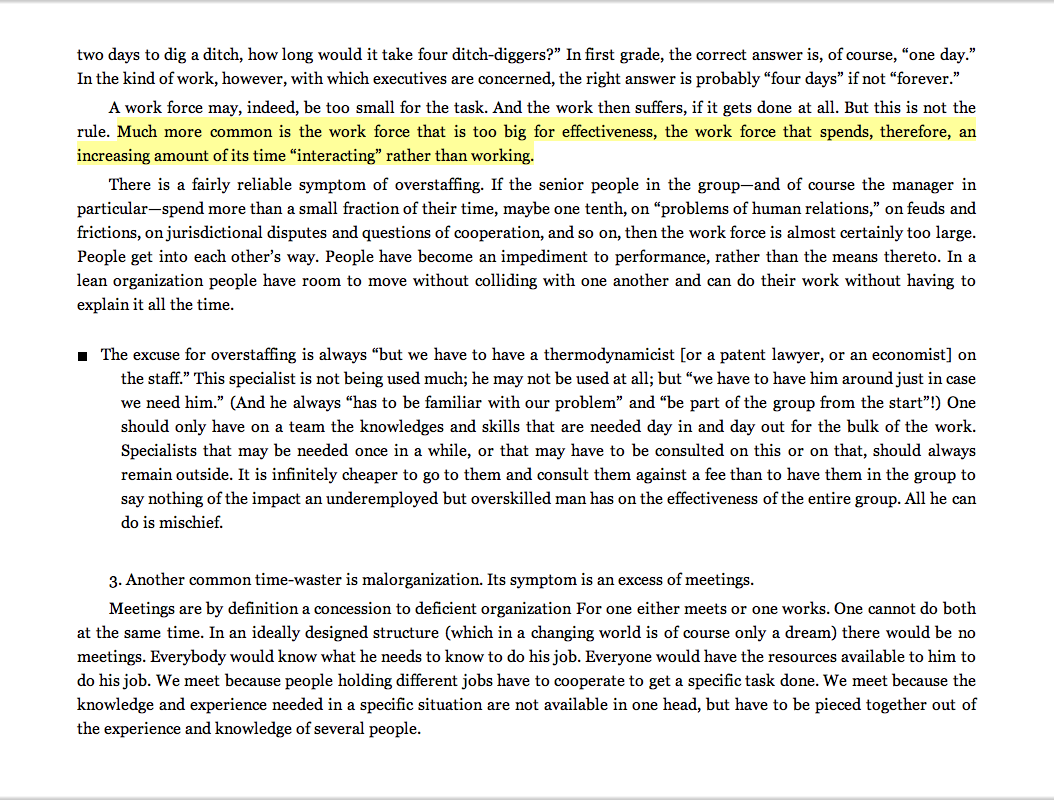 “Much more common is the work force that is too big for effectiveness, the work force that spends, therefore, an increasing amount of its time ‘interacting’ rather than working.”
