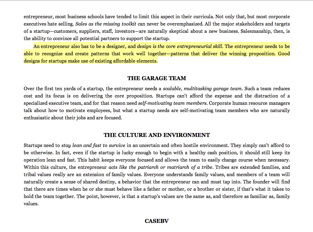 “An entrepreneur also has to be a designer, and design is the core entrepreneurial skill. The entrepreneur needs to be able to recognize and create patterns that work well together—patterns that deliver the winning proposition. Good designs for startups make use of existing affordable elements.”