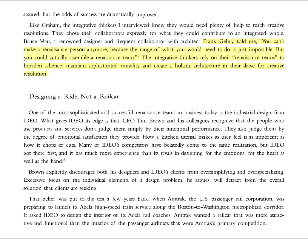 “Frank Gehry told me, ‘You can’t make a renaissance person anymore, because the range of what you would need to do is just impossible. But you could actually assemble a renaissance team.’ The integrative thinkers rely on their ‘renaissance teams’ to broaden salience, maintain sophisticated causality, and create a holistic architecture in their drive for creative resolution.”