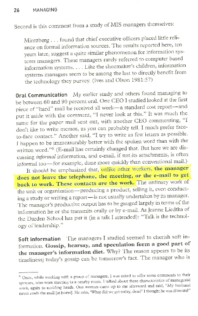 “Unlike other workers, the manager does not leave the telephone, the meeting, or the e-mail to get back to work. These contacts are the work.”