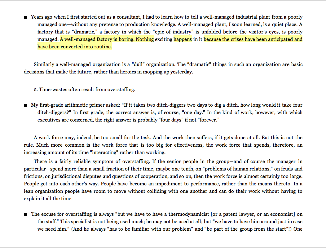 “A well-managed factory is boring. Nothing exciting happens in it because the crises have been anticipated and have been converted into routine.”