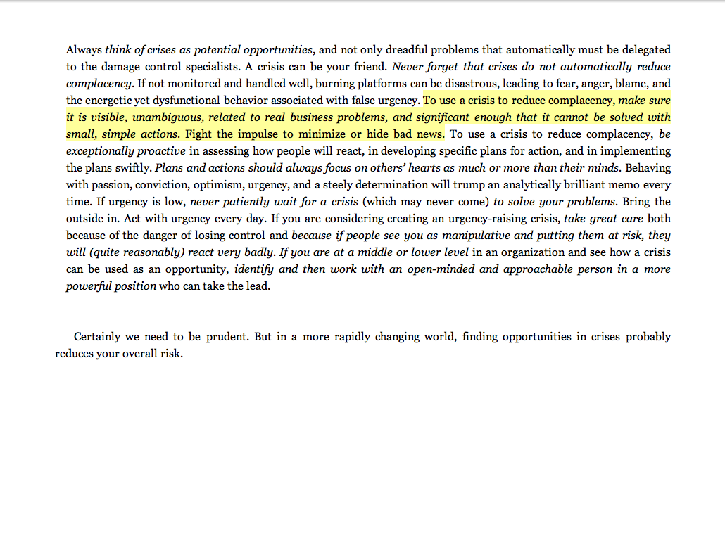 “To use a crisis to reduce complacency, make sure it is visible, unambiguous, related to real business problems, and significant enough that it cannot be solved with small, simple actions.