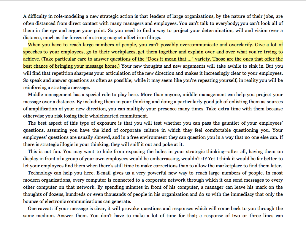 “When you have to reach large numbers of people, you can’t possibly over communicate and over clarify. Give a lot of speeches to your employees, go to their workplaces, get them together and explain over and over what you’re trying to achieve. (Take particular care to answer questions of the ‘Does it mean that. . .’ variety. Those are the ones that offer the best chance of bringing your message home.)”