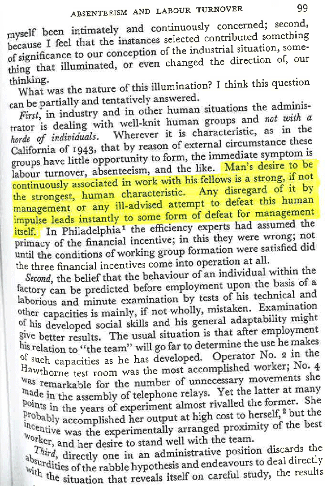 “Man’s desire to be continuously associated in work with his fellows is a strong, if not the strongest, human characteristic. Any disregard of it by management or any ill-advised attempt to defeat this human impulse leads instantly to some form of defeat for management itself.”