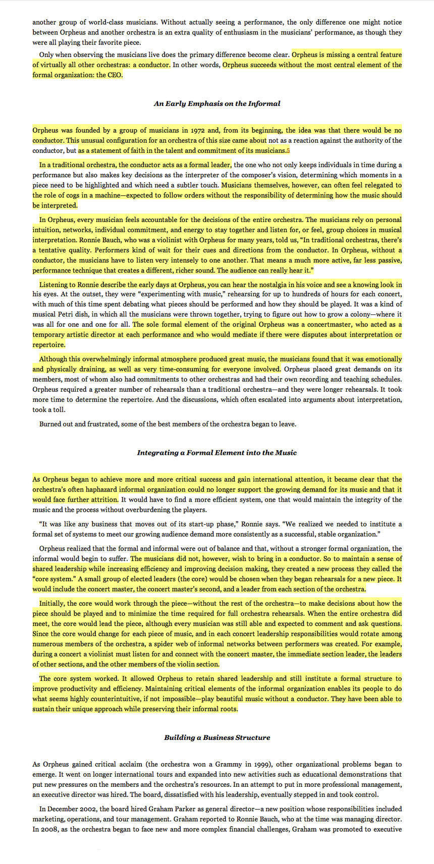 The core system allowed Orpheus to retain shared leadership and still institute a formal structure to improve productivity and efficiency. Maintaining critical elements of the informal organization enables its people to do what seems highly counter-intuitive, if not impossible—play beautiful music without a conductor. They have been able to sustain their unique approach while preserving their informal roots.”