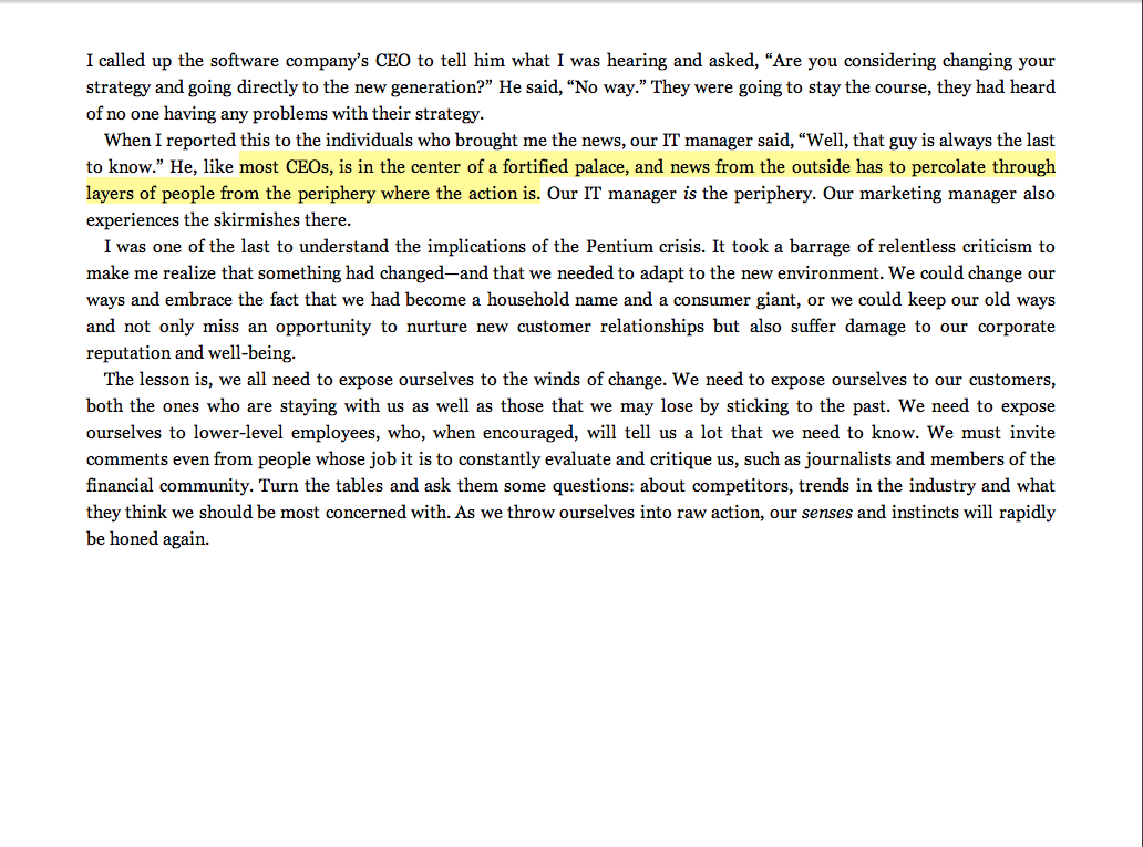 “Most CEOS [are] in the center of a fortified palace, and news from the outside has to percolate through layers of people from the periphery where the action is.”