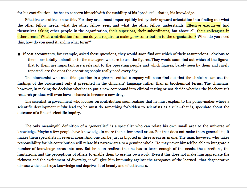 “Effective executives [ask] . . . their superiors, their subordinates, [and] their colleagues in other areas: ‘What contribution from me do you require to make your contribution to the organization?’ ”