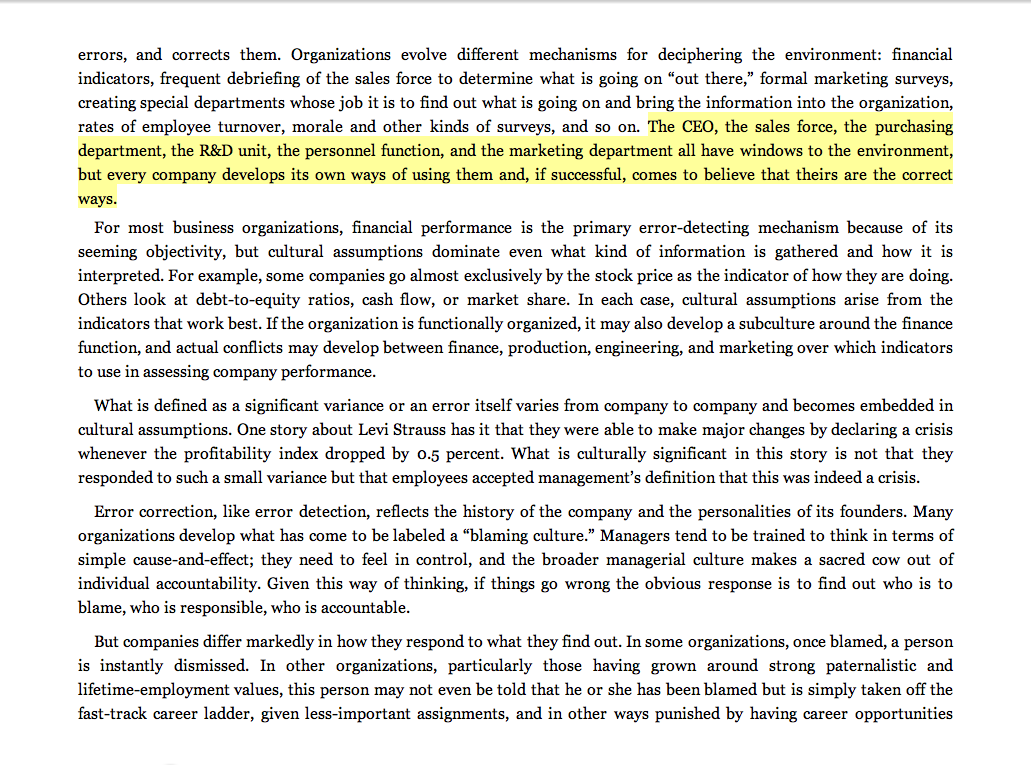 “The CEO, the sales force, the purchasing department, the R&D unit, the personnel function, and the marketing department all have windows to the environment, but every company develops its own ways of using them and, if successful, comes to believe that theirs are the correct ways.”
