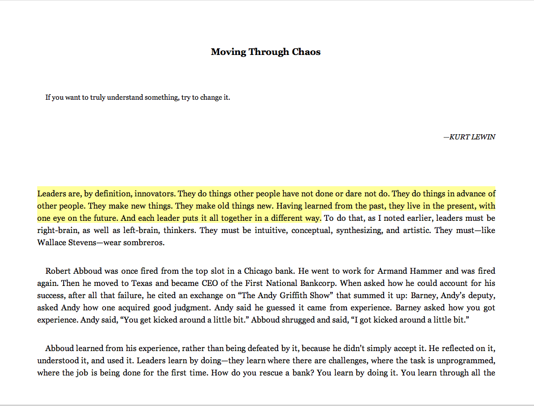 “Leaders are, by definition, innovators. They do things other people haven’t done or don’t do. They do things in advance of other people. They make new things. They make old things new. Having learned from the past, they live in the present, with one eye on the future. And each leader puts it all together in a different way.”