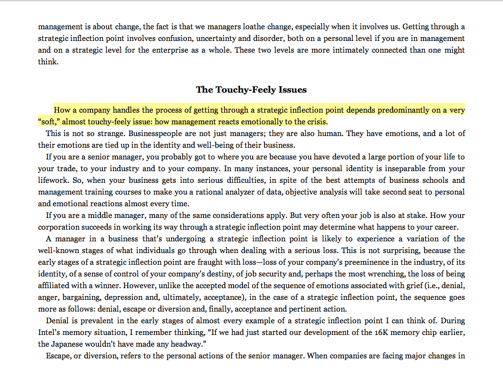 “How a company handles the process of getting through a strategic inflection point depends predominantly on a very ‘soft,’ almost touchy-feely issue: how management reacts emotionally to the crisis.”