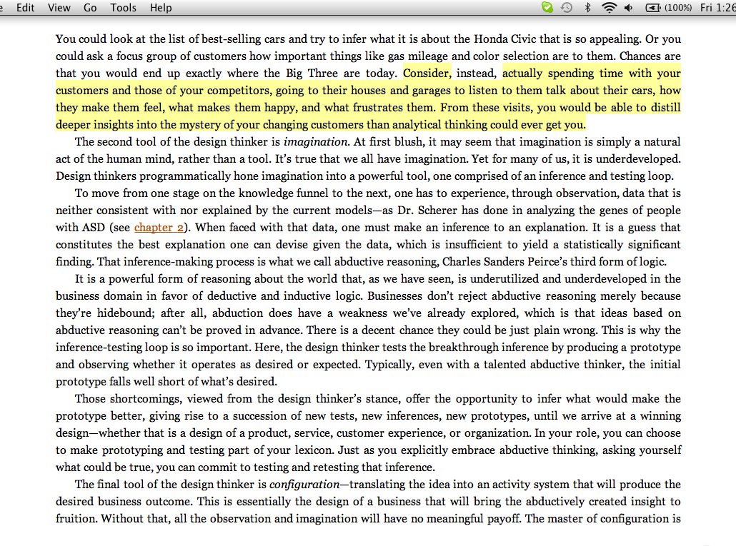 “Consider . . . actually spending time with your customers and those of your competitors, going to their houses and garages to listen to them talk about their cars, how they make them feel, what makes them happy, and what frustrates them. From these visits, you would be able to distill deeper insights into the mystery of your changing customers than analytical thinking could ever get you.”