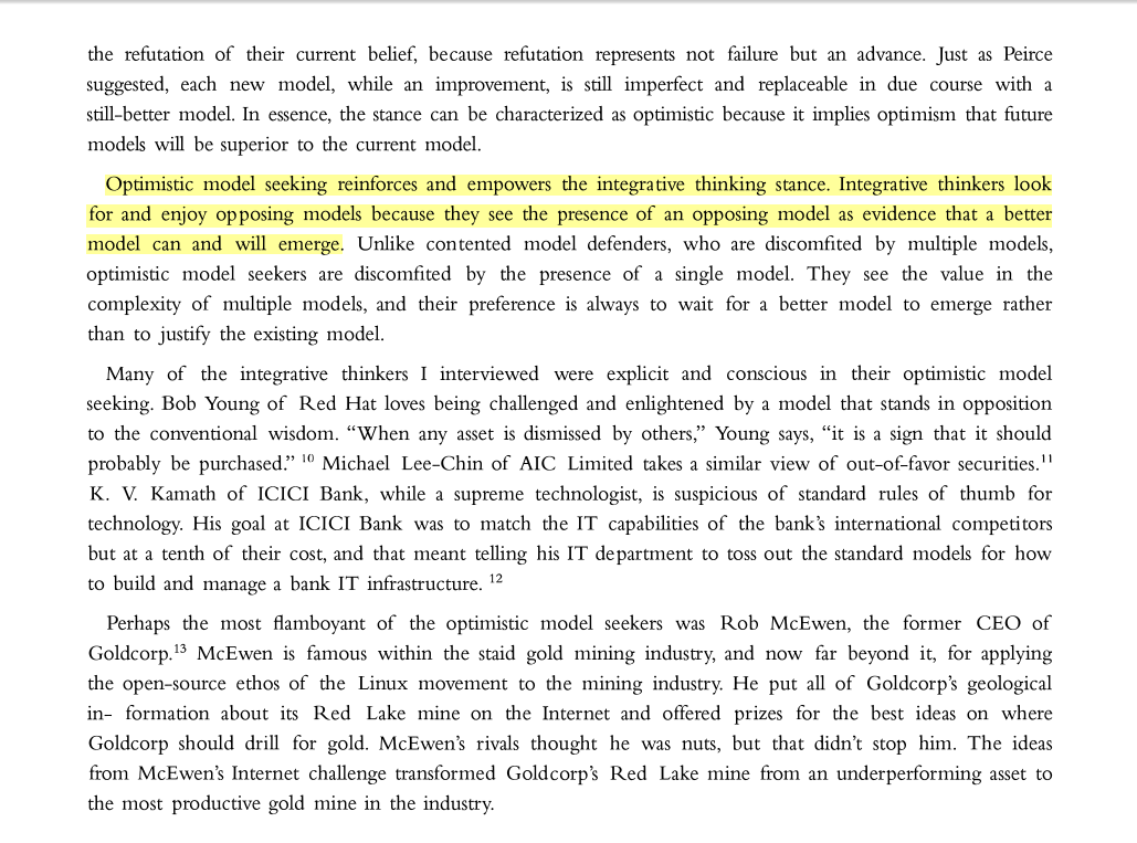 “Optimistic model seeking reinforces and empowers the integrative thinking stance. Integrative thinkers look for and enjoy opposing models because they see the presence of an opposing model as evidence that a better model can and will emerge.”