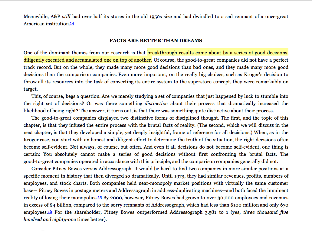 “Breakthrough results come about by a series of good decisions, diligently executed and accumulated one on top of another.”