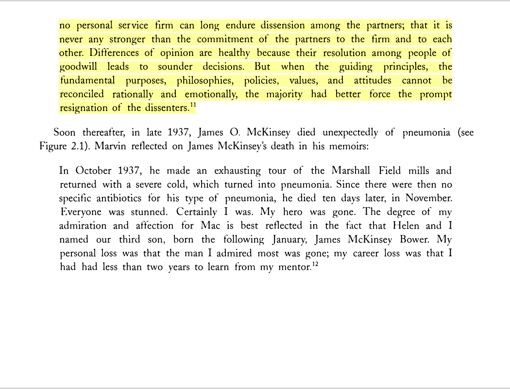 “No personal service firm can long endure dissension among the partners; that it is never any stronger than the commitment of the partners to the firm and to each other. Differences of opinion are healthy because their resolution among people of goodwill leads to sounder decisions. But when the guiding principles, the fundamental purposes, philosophies, policies, values, and attitudes cannot be reconciled rationally and emotionally, the majority had better force the prompt resignation of the dissenters.”