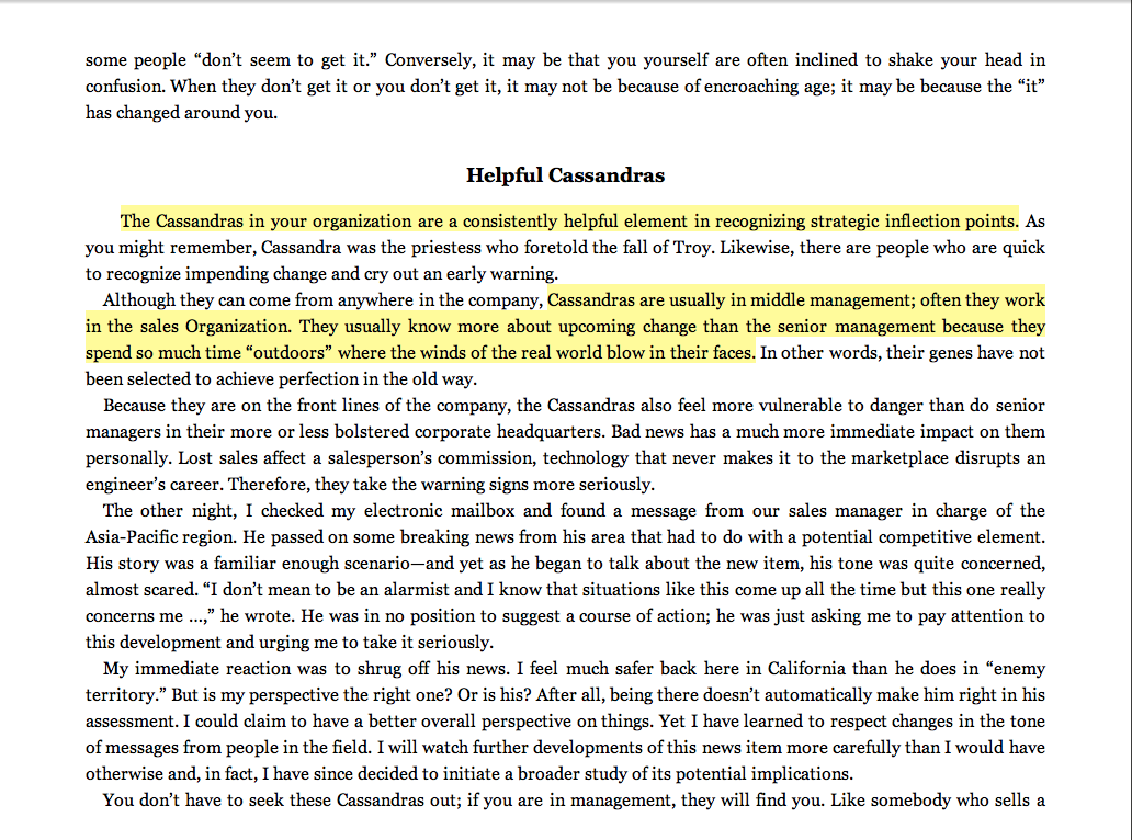 “The Cassandras in your organization are a consistently helpful element in recognizing strategic inflection points. Cassandras are usually in middle management; often they work in the sales organization.