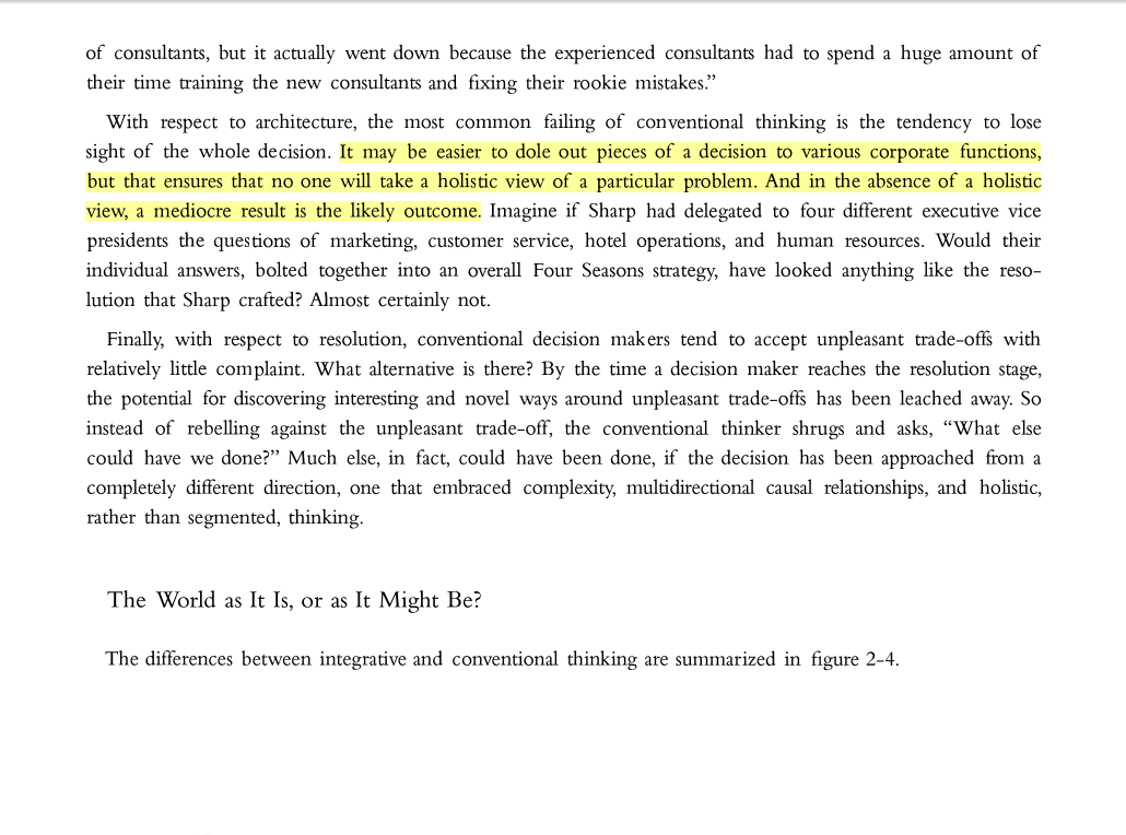 “It may be easier to dole out pieces of a decision to various corporate functions, but that ensures that no one will take a holistic view of a particular problem. And in the absence of a holistic view, a mediocre result is the likely outcome.”