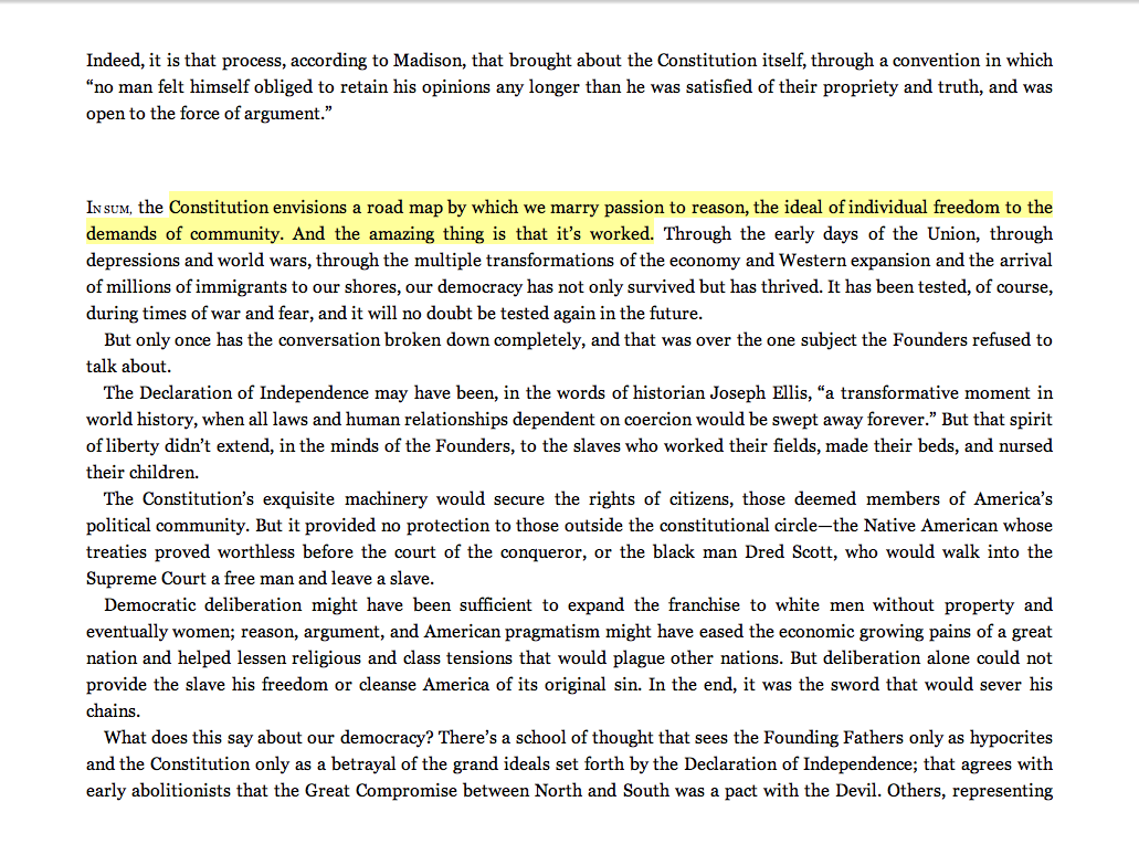 “The Constitution envisions a road map by which we marry passion to reason, the ideal of individual freedom to the demands of community. And the amazing thing is that it’s worked.”