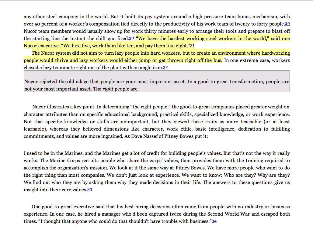 The Nucor system did not aim to turn lazy people into hard workers, but to create an environment where hardworking people would thrive and lazy workers would either jump or get thrown right off the bus.”