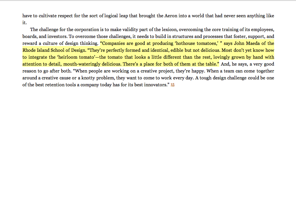 “ ‘Companies are good at producing “hothouse tomatoes,” ’ says John Maeda of the Rhode Island School of Design. ‘They’re perfectly formed and identical, edible but not delicious. Most don’t yet know how to integrate the “heirloom tomato”—the tomato that looks a little different than the rest, lovingly grown by hand with attention to detail, mouth-wateringly delicious. There’s a place for both of them at the table.’ ”
