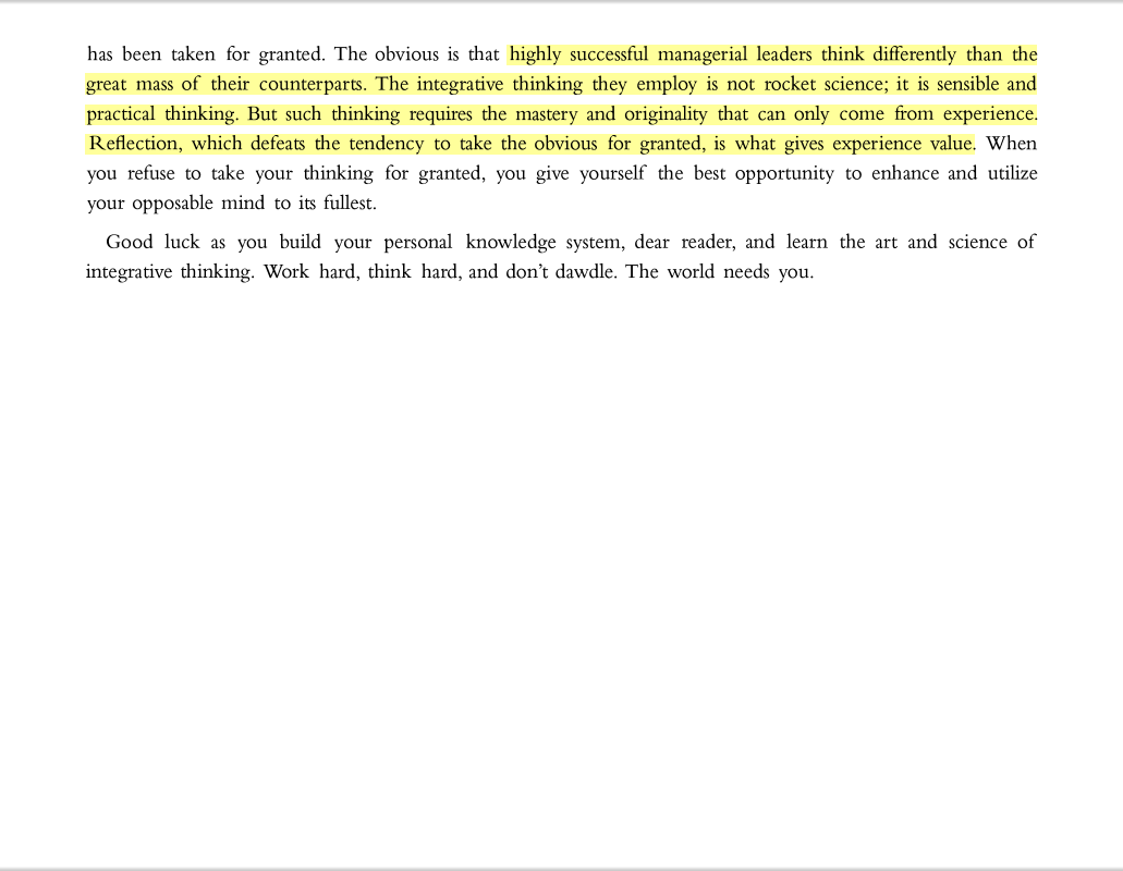 “Highly successful managerial leaders think differently than the great mass of their counterparts. The integrative thinking they employ is not rocket science; it is sensible and practical thinking. But such thinking requires the mastery and originality that can only come from experience. Reflection, which defeats the tendency to take the obvious for granted, is what gives experience value.”