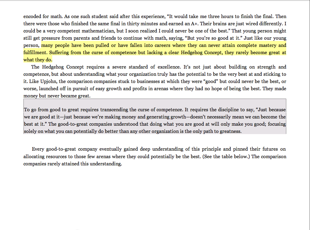 “Many people have been pulled or have fallen into careers where they can never attain complete mastery and fulfillment. Suffering from the curse of competence but lacking a clear Hedgehog Concept, they rarely become great at what they do.”