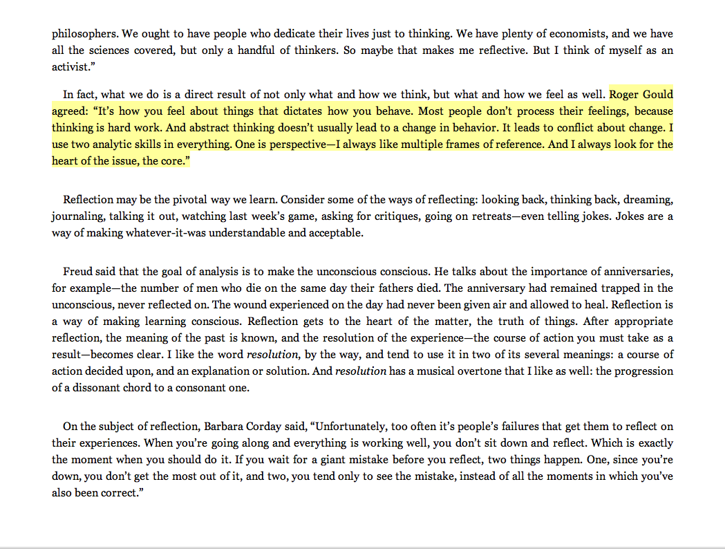 “Roger Gould agreed: ‘It’s how you feel about things that dictates how you behave. Most people don’t process their feelings, because thinking is hard work. And abstract thinking doesn’t usually lead to a change in behavior. It leads to conflict about change. I use two analytic skills in everything. One is perspective—I always like multiple frames of reference. And I always look for the heart of the issue, the core.’”