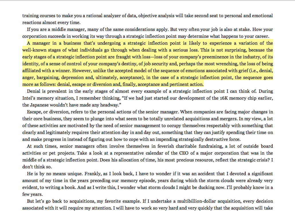 However, unlike the accepted model of the sequence of emotions associated with grief (i.e., denial, anger, bargaining, depression and, ultimately, acceptance), in the case of a strategic inflection point, the sequence goes more as follows: denial, escape or diversion and, finally, acceptance and pertinent action.”