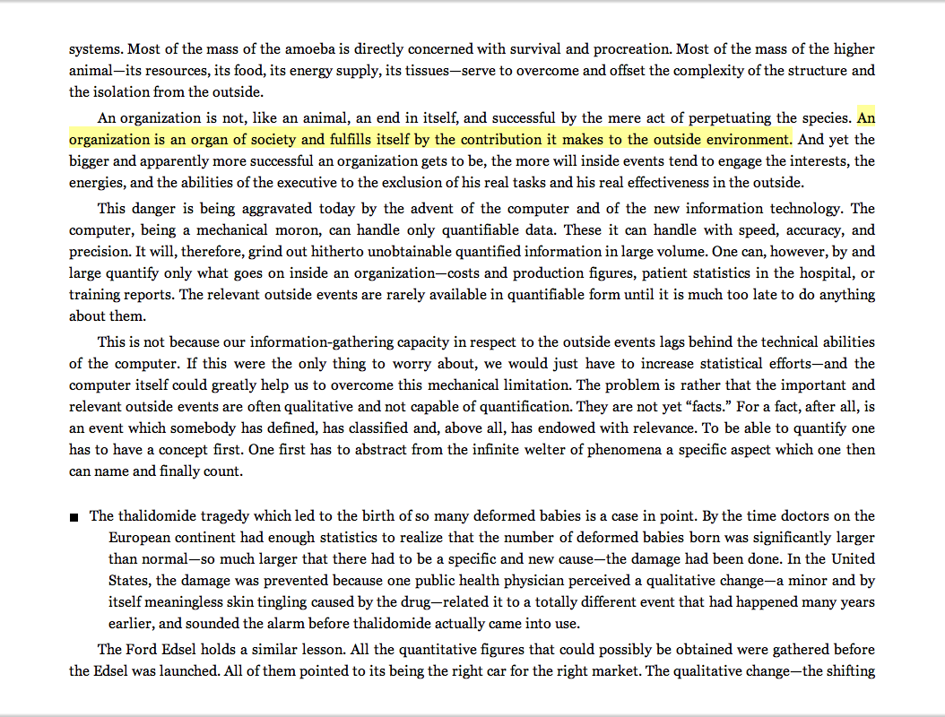 “An organization is an organ of society and fulfills itself by the contribution it makes to the outside environment.”