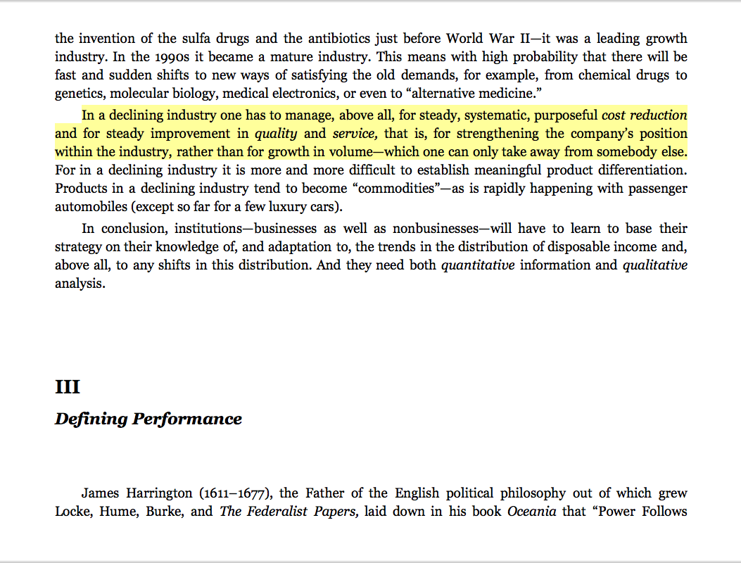 “In a declining industry one has to manage, above all, for steady, systematic, purposeful cost reduction and for steady improvement in quality and service, that is, for strengthening the company’s position within the industry, rather than for growth in volume—which one can take away from somebody else.”
